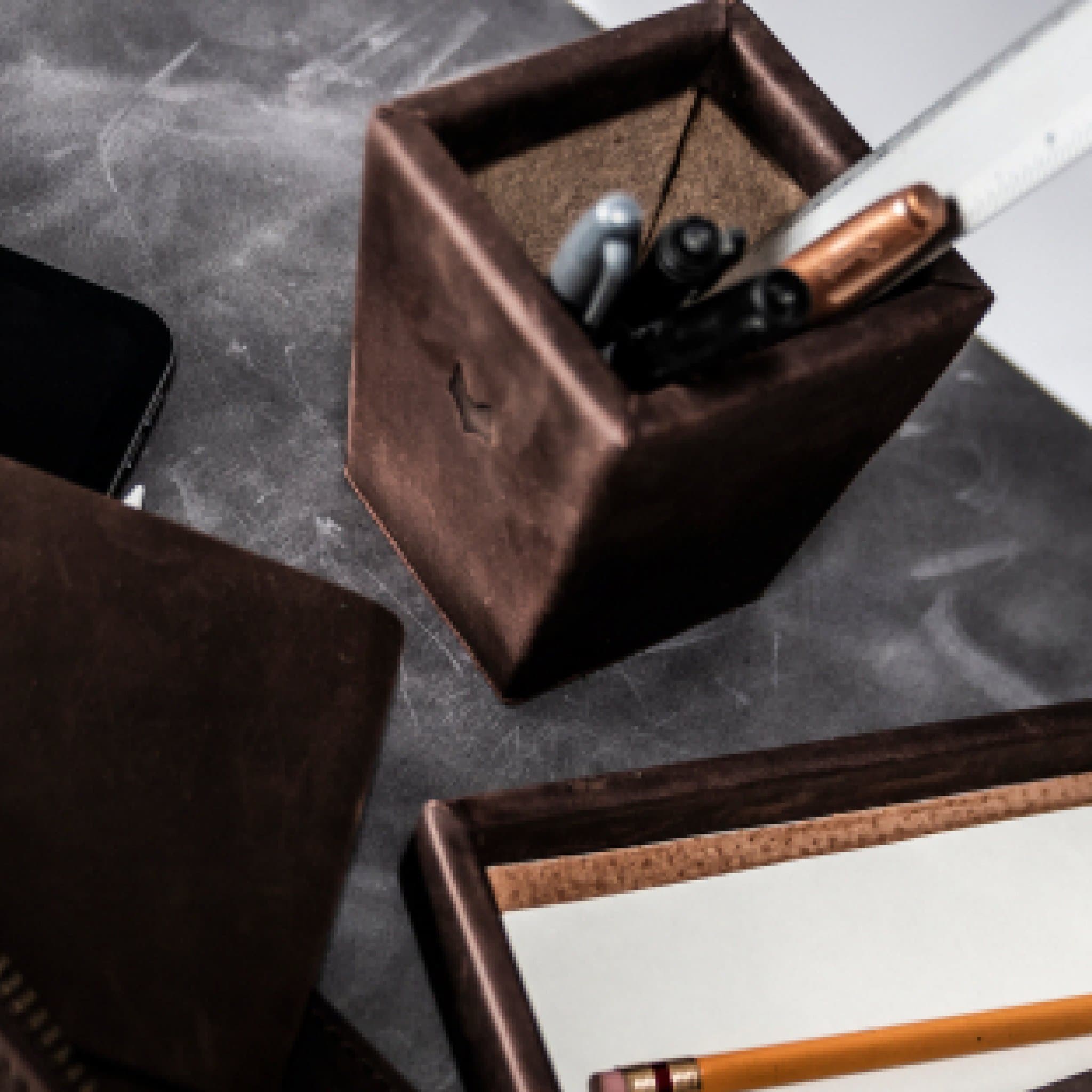 Elegante set de escritorio de cuero compuesto por un tapete para computadora, una bandeja porta papeles, una bandeja pequeña, un cubo para lapiceros y plumas y una papelera. Los productos pueden adquirirse por separado también
